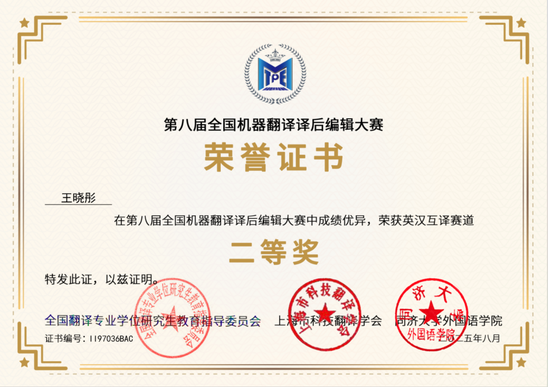 据悉,本届大赛在全国翻译专业学位研究生教育指导委员会指导下,由上海市科技翻译学会、同济大学外国语学院联合主办,上海一者信息科技有限公司(Tmxmall)承办。大赛以“技术驱动翻译变革、效率赋能语言服务、实践培育高端人才、科研拓展学科边界”为宗旨,致力于提升我国翻译行业的国际影响力。自2025年4月21日启动以来,赛事吸引了包括北京大学、西安外国语大学、广东外语外贸大学、黑龙江大学、四川外国语大学等百余所高校的顶尖选手积极参与。经过数月的激烈角逐和多轮严格评审,最终172名选手脱颖而出,其中一等奖3人、二等奖16人、三等奖45人、优胜奖108人,竞争激烈、奖项含金量十足。