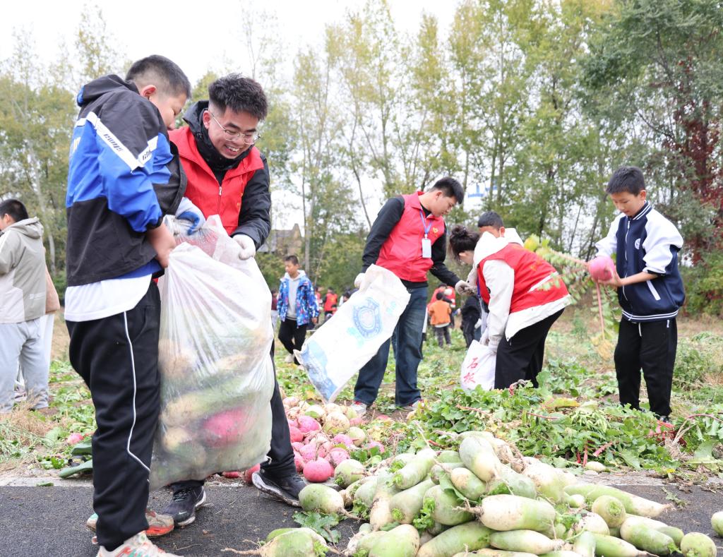 为深入贯彻落实“五育并举”的教育方针,扎实推进劳动教育实践育人工作,近日,团委副书记赵薇、计算机与信息技术学院团总支副书记孙光野带领牡师青年志愿者与紫光小学校长刘春霞、副校长芦彬、以及紫光小学的小学生们一起在紫光小学种植田开展秋收采摘活动。