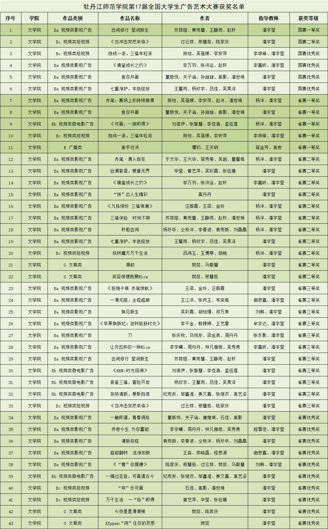 近日,第17届全国大学生广告艺术大赛评审工作圆满结束。经组委会评审,我校学生荣获国赛一等奖1项(全省2项)、二等奖1项(全省10项)、优秀奖4项,省赛一等奖5项、二等奖11项、三等奖11项、优秀奖10项。文学院教师潘宇莹荣获“优秀指导教师奖”(全省3个)。我校凭借这一系列亮眼战绩,在黑龙江省内高校中名列前茅。