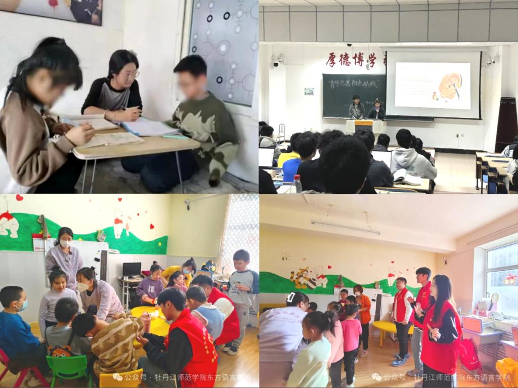 阳光助残献关爱,雷锋精神爱我心。各团总支组织阳光助残志愿服务队,结合3月3日全国“爱耳日”时间节点,开展宣传教育活动,普及听力健康科学知识,开展为残疾青少年或残疾人子女提供课业辅导、兴趣培养、亲情陪伴。东方语言学院团总支联合牡丹江市朝鲜族图书馆开展关爱孤独症儿童志愿服务活动,“爱心天使”志愿者服务队走进牡丹江启潼教育潜能发展中心,为孤独症儿童送上小礼物,陪伴做韵律操,送去温暖和关爱。计算机与信息技术学院团总支开展助残志愿服务项目宣讲活动,介绍残疾人群体的基本情况、国家政策,分享残疾人帮扶过程,讲解爱耳知识,做耳部保健操,增强计信学子对听力残疾的预防意识和能力。数学科学学院团总支组织开展残障家庭子女家教志愿服务,通过“一对一辅导”量身制定学习方案,解决学习困惑,给予残障家庭更好的社会帮助和人文关怀。