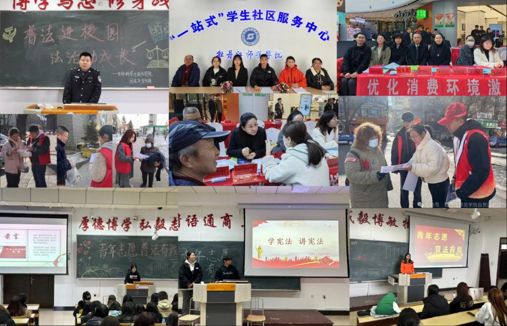 普法宣传维权益,雷锋精神护我心。各团总支组织青年普法志愿者队伍深入基层,以宣传《宪法》《民法典》《未成年人保护法》《预防未成年人犯罪法》为重点,开展“青年志愿·普法有我”志愿服务项目。法学院团总支和美术与设计学院团总支走进爱民区向阳街道林卫社区,向群众宣传“3·15”国际消费者权益日的由来及目的,讲解消费者如何预防受骗,发放宣传单200余份,深化广大群众维权意识,切实维护自身合法权益。法学院大学生法律宣讲团进驻牡丹江师范学院一站式学生社区服务中心,学生现场咨询服务与法学教师重点解答相结合;联合牡丹江市市场监督管理局等十余家单位在牡丹江万达广场开展消费者权益保护日普法宣传活动,聚焦消费热点问题,发放宣传页、宣传手册,开展口头宣讲,发挥应用型师范大学服务社会的能力。计算机与信息技术学院团总支在学院内开展志愿服务项目宣讲活动,组织学生观看宪法宣传片,深刻领悟宪法的内涵和价值,引导学生崇礼学法,弘扬宪法精神。历史与文化学院微信公众号开设“讲中国故事,传承中国精神”专栏,由“历心”宣讲团梳理讲解中国共产党人的精神谱系,学习雷锋精神,传承榜样力量。生命科学与技术学院团总支组织开展“普法进校园,法治助成长”普法宣讲活动,特邀黄花派出所二级警长以法论事,以案释法,重点讲解如何增强自我保护防范意识;微信公众号平台宣传劳动法、民法典,引导同学们学法、守法、懂法、用法,增强法治意识。体育与健康科学学院团总支组织开展“青年志愿,普法有我”主题团日活动,以宣传《宪法》《民法典》《未成年人保护法》《预防未成年人犯罪法》为重点,采取理论宣讲、知识问答、现场交流等形式,就基本的法律知识开展互动交流,学习运用法律进行自我保护。音乐与舞蹈学院团总支组织红音志愿者服务队走进牡丹江市社会福利院江滨老年休养中心,发挥专业特色,为老人表演舞蹈、歌曲、乐器演奏等文艺节目,发放普法宣传单,讲解宪法基本内容,普及常见诈骗陷阱,提醒老人们增强防诈骗意识。应用英语学院团总支在学院内组织开展宪法、民法典、知识普及活动,促进大学生形成法治观念,增强法律意识。自贸区学院团总支联合中华社区组织志愿者开展街头普法行动,讲解法律法规;开展“雷锋精神专题宣讲会”,提高志愿者法治素养,增强志愿者社会责任感和服务能力。