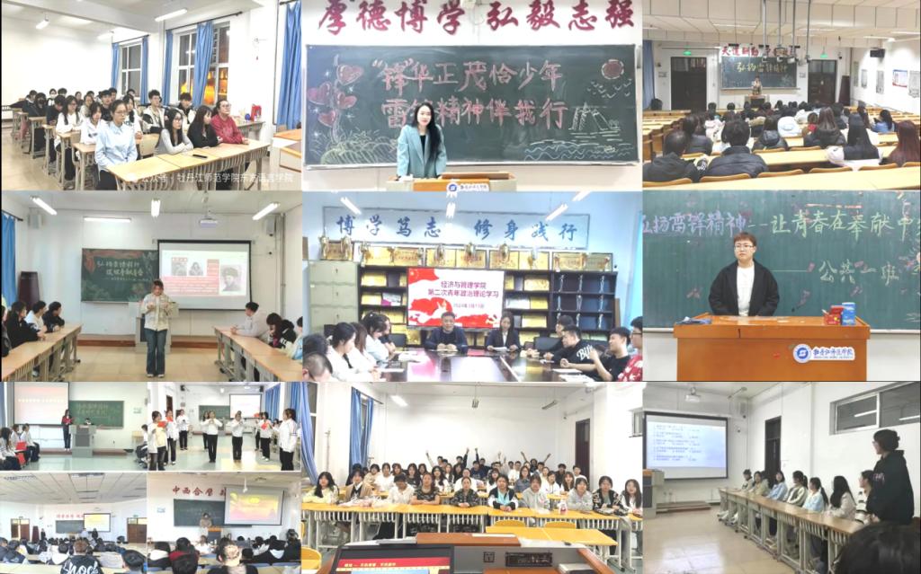 别开生面是团日,雷锋精神照我心。各基层团总支积极响应校团委的号召,组织各团支部开展主题团日、理论学习活动,深入学习雷锋精神,以实际行动将雷锋精神内化于心。东方语言学院、美术与设计学院、生命科学与技术学院、应用英语学院团总支组织青年学子深入学习雷锋同志的无私奉献的精神品质,聆听模范事迹,描绘雷锋故事,引导同学们以雷锋同志为榜样,深刻领会雷锋精神的时代价值。化学化工学院团总支组织开展主题演讲,交流学习体会。经济与管理学院团总支召开青年政治理论学习小组学习会议,学院党委书记、辅导员领学“践行雷锋精神”主题内容,引导同学们树立崇高理想、提升学习能力、强化服务本领、弘扬雷锋精神、践行志愿精神。数学科学学院团总支组织宣读入团誓词、观看主题相关视频,开展演讲朗诵、歌曲舞蹈、小品情景剧、知识竞答等系列活动。体育与健康科学学院团总支组织学生开展“社区服务暖,志愿总动员”主题团日活动暨志愿服务动员大会,以模拟体验的形式组织引导广大团员青年和青年志愿者深入社区,动员更多的同学为志愿服务贡献力量。