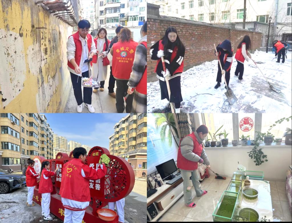 社区街道送温暖,雷锋精神映我心——清扫社区路。化学化工学院团总支带领春晖志愿者服务队走进西华园小区开展小广告清理工作,本科生第一党支部前往庆发社区开展党建联盟志愿活动,清扫社区街道上的积雪及白色垃圾,传承“铁”系精神,以实际行动践行为群众服务的宗旨。计算机与信息技术学院、音乐与舞蹈学院团总支组织青年志愿者走进文化社区清扫积雪,打造干净整洁的居住环境,为社区居民出行带来便利,以高度的责任感和热心、严谨、稳重的工作态度赢得了居民的一致好评。物理与电子工程学院团总支走进耐火社区开展社区公共区域清扫活动,用责任和担当赋予雷锋精神新的时代意义。