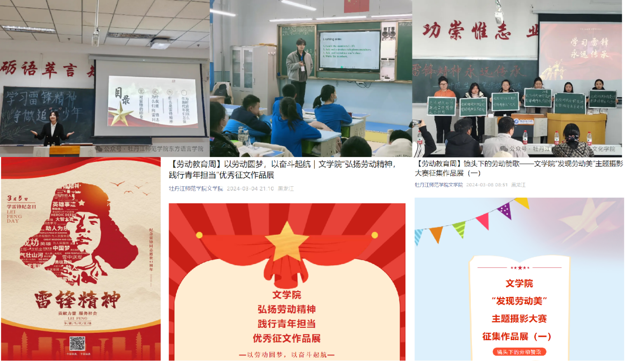 专业知识传薪火,雷锋精神育我心。东方语言学院团总支组织开展“学习雷锋精神,争做追‘锋’少年”主题演讲比赛,以饱满的热情和富有感染力的语言诠释雷锋同志乐于奉献、艰苦奋斗的精神,展现青年学子风采,让雷锋精神的种子在同学们心中生根发芽。计算机与信息技术学院团总支推进与师范附小的深度合作,组织成立首批支教团赴师范附小开展为期一年的支教活动,引导同学们掌握学科的教学方法和技能,精心准备“开学第一课”,用最饱满的精神风貌展现才能,爱心支教,传递梦想。历史与文化学院团总支组织开展“传承雷锋精神,争做时代新人”主题粉笔字大赛,培养同学们的心性和毅力,锻炼师范生的专业素养和职业技能。美术与设计学院团总支组织开展学雷锋精神主题海报设计大赛,引导同学们在今后的学习和生活中以实际行动践行雷锋精神、展现青春本色。体育与健康科学学院组织开展“发现劳动美”摄影大赛,用一个个镜头去捕捉劳动者的风采,用一颗颗真心去感悟各种劳动的美,教育引导学生热爱劳动、崇尚劳动、诚实劳动、享受劳动。文学院团总支组织开展“弘扬劳动精神,践行青年担当”主题征文活动,引导广大学生崇尚劳动、热爱劳动、尊重劳动;举办“劳动发现美”主题摄影大赛,用镜头记录老师、工人师傅、安保阿姨等平凡而伟大的劳动场景,讲述关于劳动的故事,传递对劳动者的尊重和赞美。