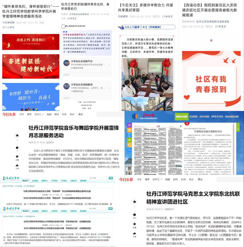 “学雷锋”活动月开展至今,我校师生志愿活动受到黑龙江日报、黑龙江广播电视台、中国教育在线、多彩大学生网、大学生社会实践前沿、今日高校网、今日头条、极光新闻、龙头新闻、文明爱民等知名媒体的宣传报道,在社会上引起广泛关注和强烈反响。其中多彩大学生网、今日头条报道了马克思主义学院“雪域先声”东北抗联精神宣讲团走进祥伦社区、青马先锋志愿服务队开展“青年志愿 情暖社区”志愿服务活动,“文明爱民”微信公众平台报道了美术与设计学院“青年志愿·美丽乡村”志愿服务活动,中国教育在线报道了生命科学与技术学院“青年志愿,情暖社区”志愿服务活动,大学生社会实践前沿、今日高校网报道了数学科学学院“缅怀革命先烈,身怀感恩前行”学雷锋精神志愿服务活动,“文明爱民”微信公众平台报道了物理与电子工程学院“科普百变,奇妙科学”物理知识进社区活动,极光新闻报道了西方语言学院“社区有我,青春报到”进社区志愿服务活动,今日头条、江滨老年修养中心视频号、龙头新闻报道了音乐与舞蹈学院进牡丹江江滨老年休养中心活动。这是对学校师生们的肯定,更是对新时代青年学雷锋、做雷锋精神的传承者和践行者的鼓励。