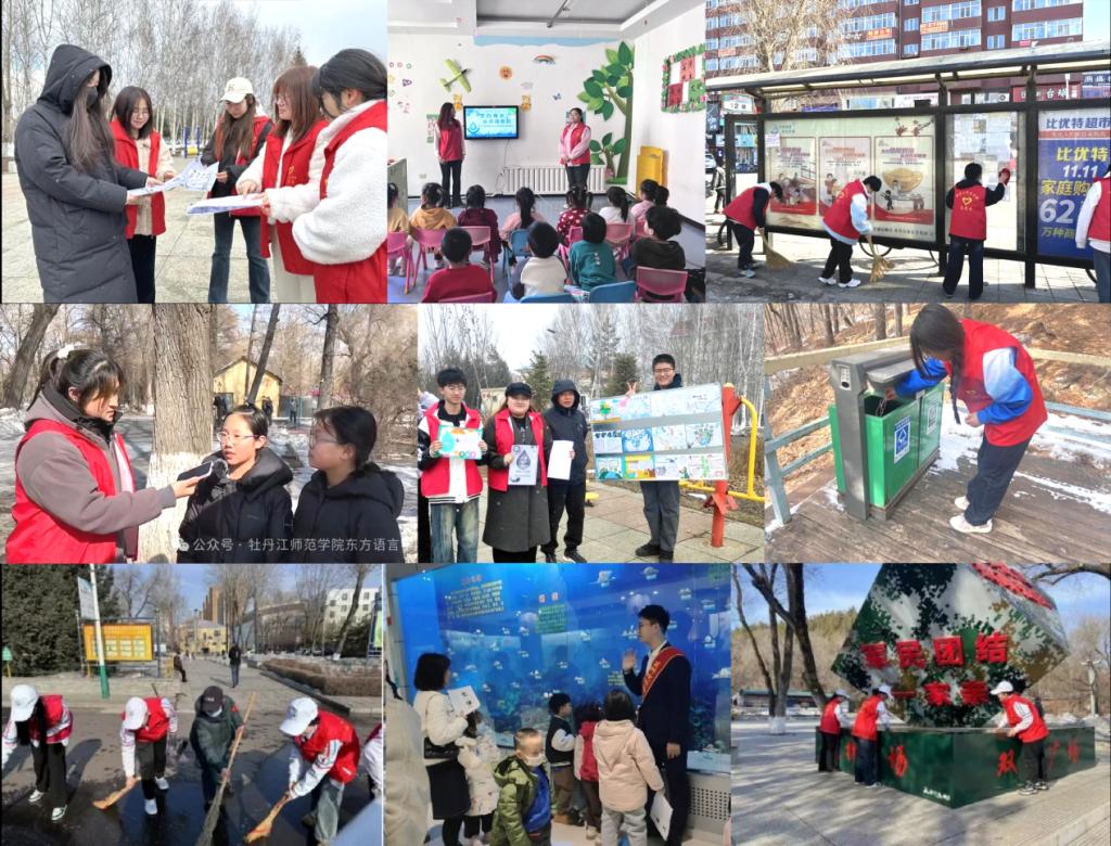 绿水青山好生态,雷锋精神植我心。各团支部组织青年志愿者志愿服务队在植树节、世界水日、世界气象日等时间节点,围绕植树护绿、珍水节水等方面,开展“青年志愿·生态龙江”志愿服务项目。东方语言学院团总支组织学生志愿者来到牡丹江市人民公园,随机采访过往市民,询问对环保的认识和妙招,宣传生态文明知识,集中清理公园杂物,践行“绿水青山就是金山银山”理念。化学化工学院团总支组织春晖志愿者服务队走进金色阳光幼儿园,普及节水小知识,讲述《放牛娃王二小》的故事,组织手工制作,激发节水、爱水、护水的意识,播下绿色生态文明的种子,传递人与自然和谐共生的美好愿景。计算机与信息技术学院团总支组织开展“青年志愿·创建文明城市”志愿服务活动,志愿者们走上街头、清洗公交站牌、路灯杆等设施,身体力行开展人居环境整治提升工作,进一步提升城市环境卫生面貌。经济与管理学院团总支组织晨光志愿者服务队前往北山公园,捡拾公园垃圾,清理道旁树枝,排除头顶危险树枝,相互分享环境保护知识,发扬新时代青年不怕苦、不怕累的奉献精神。生命科学与技术学院团总支组织开展“小手拉大手”文明实践科学科普活动,带领牡丹江市教育第五幼儿园百余名师生走进校标本馆,科普生态系统知识,秉持志愿服务精神,讲好标本馆故事。数学科学学院团总支组织学生党员、志愿者们开展“缅怀革命先烈,身怀感恩前行”学雷锋精神志愿服务活动,对北山公园烈士墓围栏、公共活动区域、宣传栏等进行清理,以实际行动践行志愿服务精神。体育与健康科学学院团总支组织学生在校园内开展植树节主题活动,学习“促进人与自然和谐共生”的具体举措以及植树节的历史起源,让同学们充分认识到“植绿、爱绿、护绿”的重要意义。应用英语学院团总支组织“英鸽”志愿者服务队前往牡丹江市明珠广场,向市民分发以节约用水、低碳环保为主题的传单,清理广场垃圾,通过志愿服务活动积极践行生态文明理念。