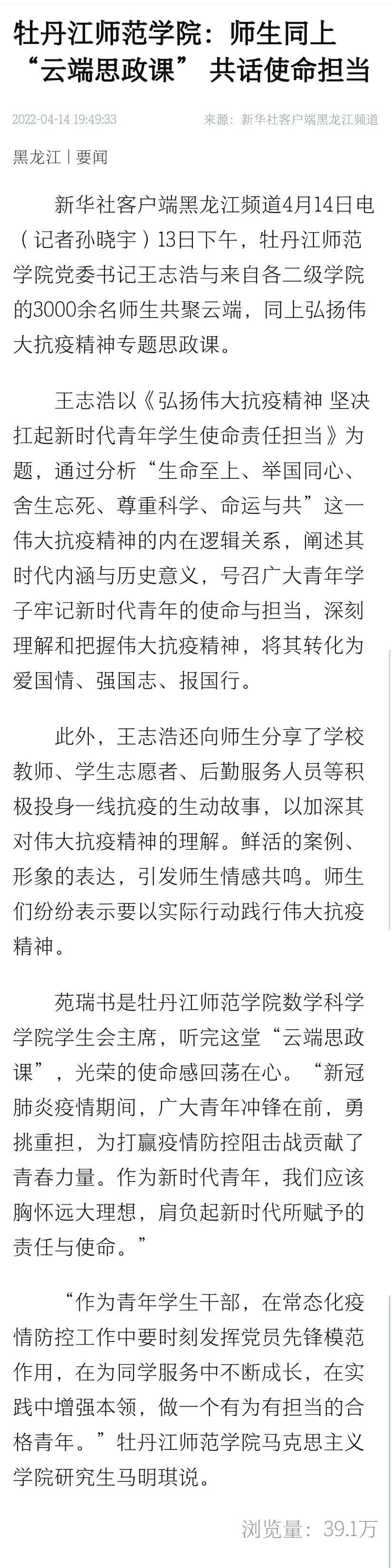 新华社客户端黑龙江频道4月14日电(记者孙晓宇)13日下午,牡丹江师范学院党委书记王志浩与来自各二级学院的3000余名师生共聚云端,同上弘扬伟大抗疫精神专题思政课。