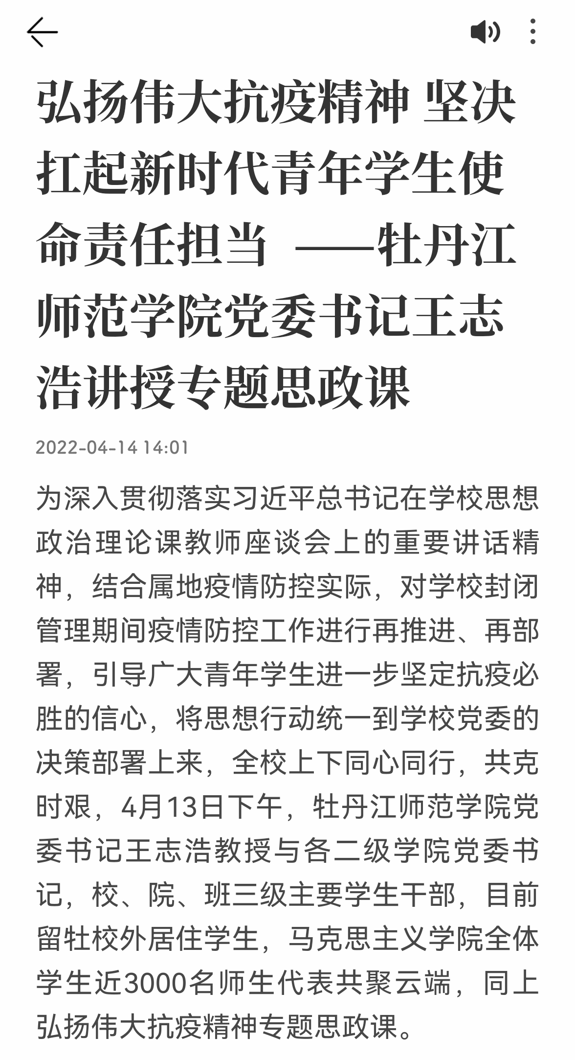 为深入贯彻落实习近平总书记在学校思想政治理论课教师座谈会上的重要讲话精神,结合属地疫情防控实际,对学校封闭管理期间疫情防控工作进行再推进、再部署,引导广大青年学生进一步坚定抗疫必胜的信心,将思想行动统一到学校党委的决策部署上来,全校上下同心同行,共克时艰,4月13日下午,牡丹江师范学院党委书记王志浩教授与各二级学院党委书记,校、院、班三级主要学生干部,目前留牡校外居住学生,马克思主义学院全体学生近3000名师生代表共聚云端,同上弘扬伟大抗疫精神专题思政课。