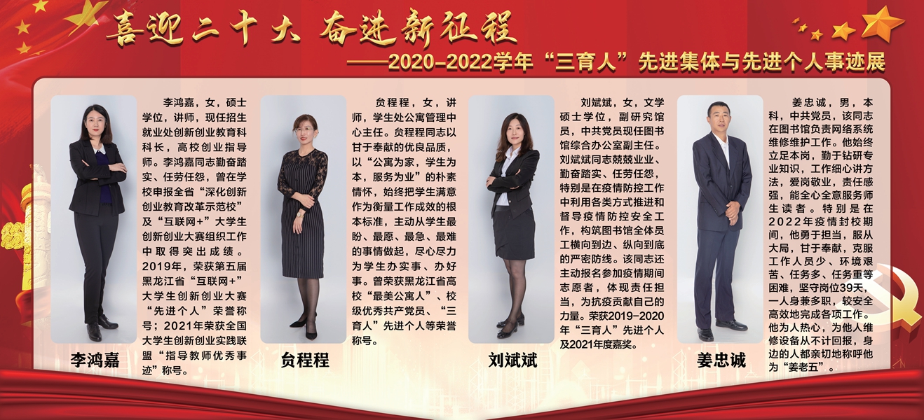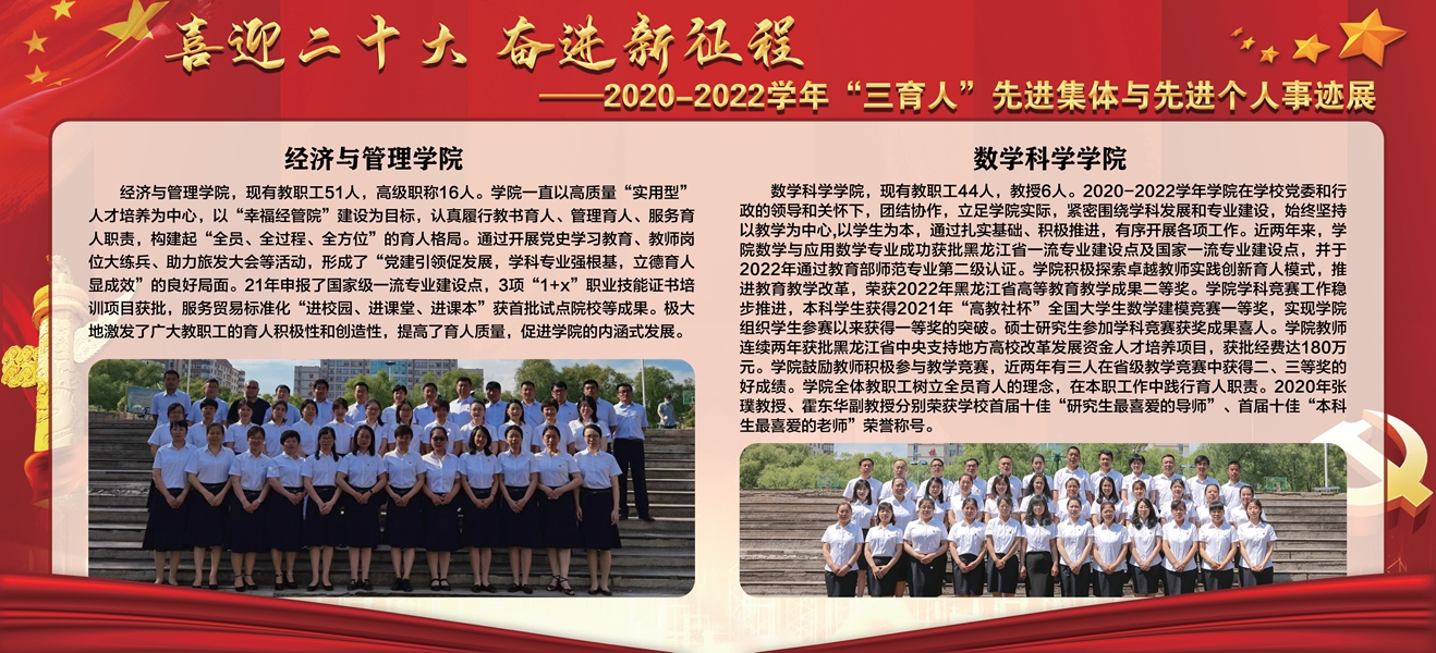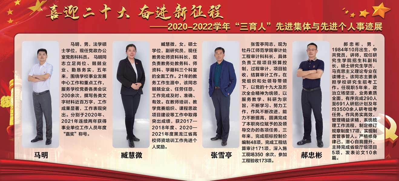 下一条:【喜迎党的二十大 培根铸魂育新人】牡丹江师范学院第三届“三育人”标兵——数学科学学院副教授赵文英