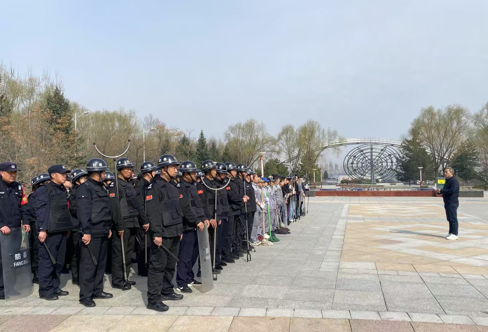 为提高我校安保及服务保障人员反恐处突能力,深入推进“平安校园”建设,4月21日,保卫处在时光广场和“一站式”学生社区组织春季学期反恐技能培训演练。爱民公安分局反恐怖大队队长李晓鹏、副大队长佟飞、驻校民警蔡翠良,保卫处、学生处公寓中心全体职工,物业公司安保及保洁等人员约130人参加培训演练,本次培训演练活动邀请牡丹江市反恐处突培训教官赵兵同志进行授课,培训演练活动由保卫处副处长伍勇兵主持。