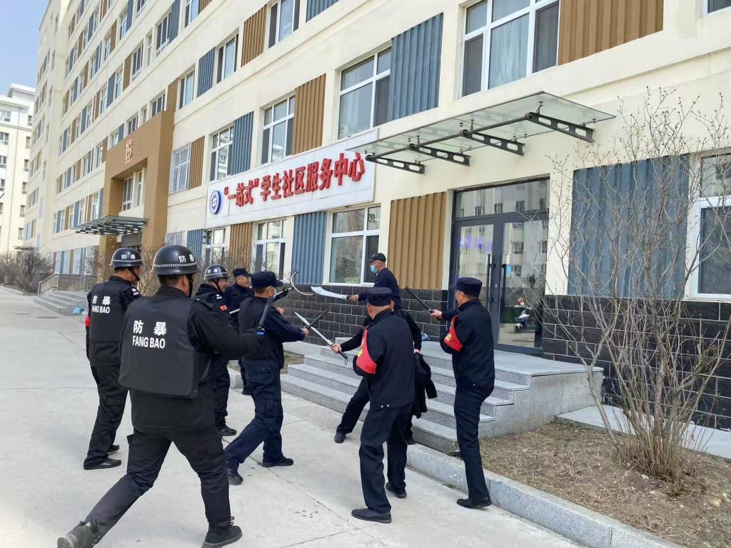 反恐处突技能培训结束后,以学校“一站式”学生社区服务中心遭遇2名持刀“暴恐嫌疑人”袭击为假想敌,进行实战拉动处突演练。按照发现暴恐嫌疑人、启动公寓反恐处突应急预案、校内报警请求警力增援、启动学校应急处突预案、校园反恐处突分队及时赶到事发地点处置、拨打牡丹江市公安局报警电话,请求驻地防暴警力增援、安保人员移交“暴恐嫌疑人”,移交后安保人员转为秩序维护等程序进行演练。本次实战化演练过程连贯,处置及时果断,取得了预期效果。
