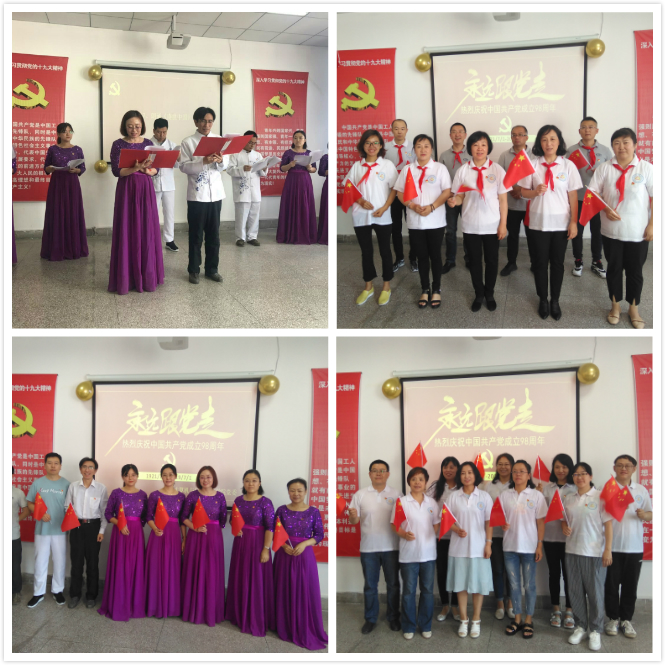 朗朗诵读声,悠悠爱党情。学生党支部带来的《走进中国共产党》让全体党员回顾了中国共产党98年的风雨历程和辉煌历史;在教师第一、第二、第三党支部带来的《我的祖国》《盛世中国》等饱含深情的诗朗诵以及《我和我的祖国》等委婉动听的歌曲中,大家感受到了历史的沉淀以及强大的民族精神,坚定了为建设祖国而奋斗的决心。