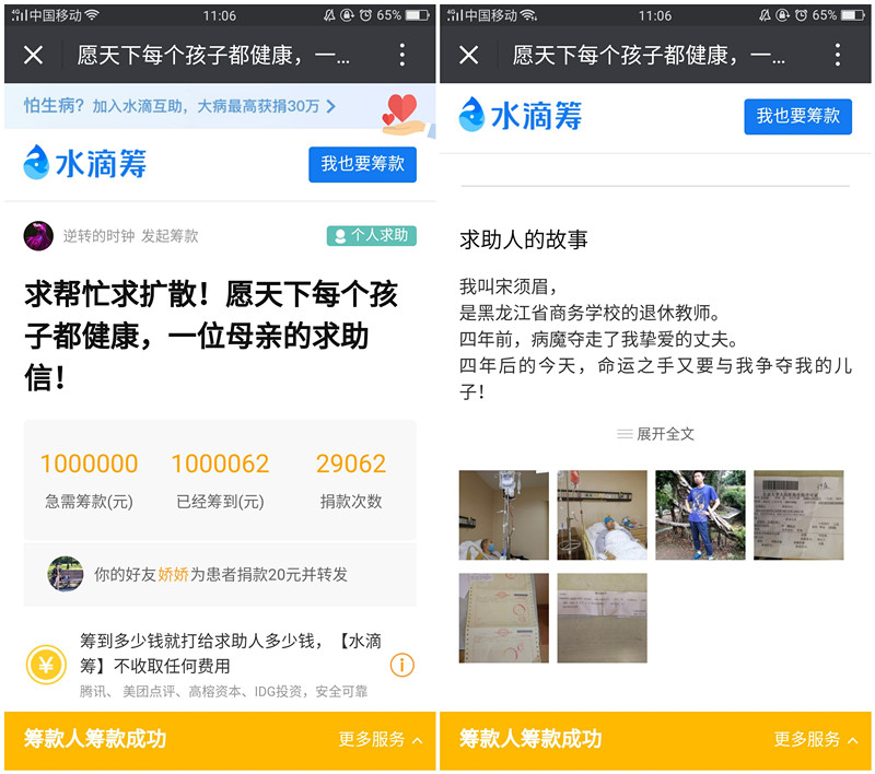 宋须眉:彻夜难眠,不是因为水滴筹款的额度,而是因为水滴筹过程给孩子带来的人生证悟------妈妈,我以前是不是太不自信了?妈妈,我以前是不是太自私了?妈妈,我以前是不是太狭隘了……沉痛的反思,比任何说教都有效!我的新我对这个世界和自己的生命,忽然间,有了一个更深的认识和理解,他长大了,走出了小我,突变成大我;他坚毅了,对战胜病魔充满了必胜的信念!这是作为母亲,作为教师最希望看到的结果!