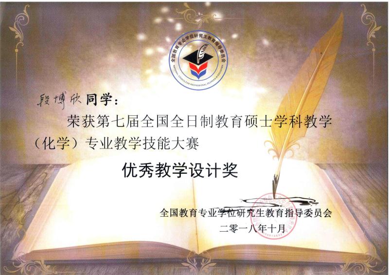 据悉,本次大赛由全国教育专业学位研究生教育指导委员会主办,重庆师范大学承办,中国教育学会化学教学专业委员会提供学术指导。来自全国各地51所参赛院校的99名选手共聚美丽的“山城”重庆市。大赛分为初赛和决赛两个阶段,决赛采用现场模拟授课和即席答辩的方式进行,全面考察选手的学科素养和教育教学能力。化学化工学院2位选手在比赛中依靠扎实的专业知识、优秀的教学技能、良好的心态展现出了学院教师教育综合改革的优异成果和学生良好的综合素质。