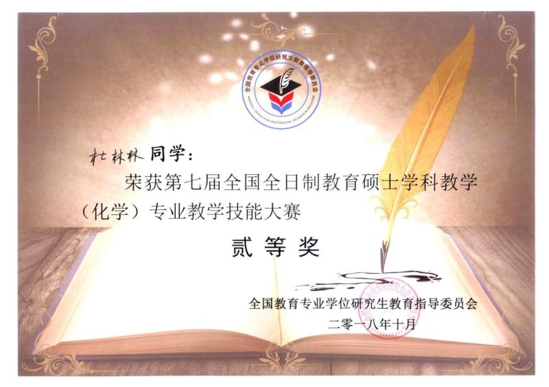 10月22日,“第七届全国全日制教育硕士学科教学(化学)专业教学技能大赛”正式落下帷幕。化学化工学院学生杜林林荣获二等奖,段博欣荣获优秀教学设计奖;教师王慧教授荣获优秀指导教师奖。