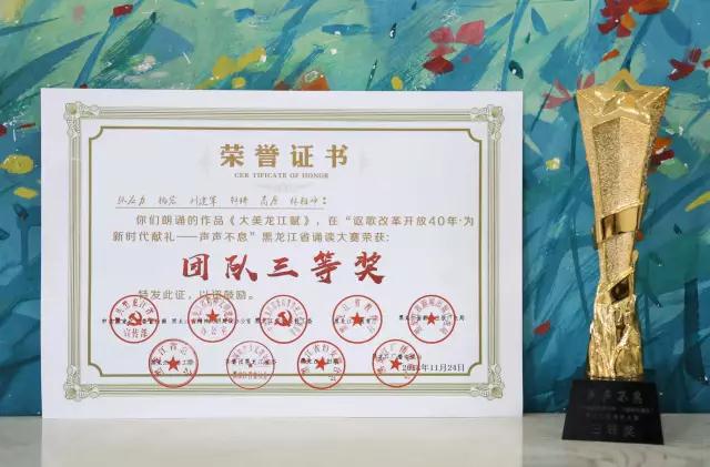 11月17日,由中共黑龙江省委宣传部、黑龙江省精神文明建设办公室、黑龙江省委教育工委、黑龙江省教育厅、黑龙江省新闻出版局、黑龙江省总工会、共青团黑龙江省委、黑龙江省妇联、黑龙江广播电视台主办的“讴歌改革开放40年·为新时代献礼——声声不息”黑龙江省诵读大赛决赛在哈尔滨举行,我校选送的作品《大美龙江赋》获得团队三等奖,名列全省高校成绩第三名,并获得网络人气投票第四名的好成绩。