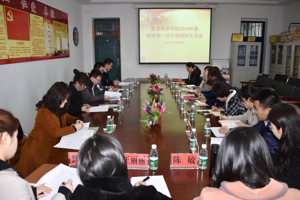 3月29日,教育科学学院教师第一党支部2018年度组织生活会暨民主评议党员大会在文科楼222会议室召开。省委组织部组织二处崔伟、王忠伟,市委组织部唐黎黎、何东桓在校组织部魏代梅陪同下出席并指导会议。会议由支部书记王华主持。