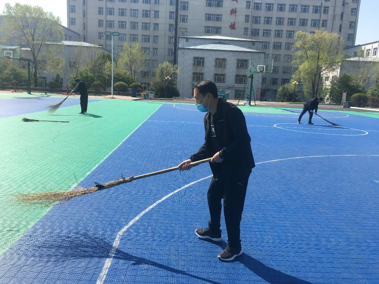 因学校封闭管理,校园内保洁人员短缺,后勤党总支书记张辉带领党员同志,以综合楼为中心将校园划分为东西两个片区,带头清扫广场、学生公寓、篮球场、运动场、东湖、南北校门及各条道路环境卫生。