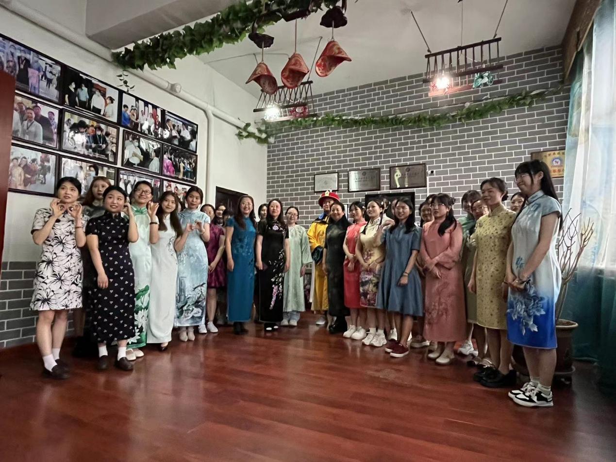 师生们跟随贾老师学习了满族旗袍“盘扣和蝴蝶扣胸针”的制作技艺,穿上了精致华美、技艺精湛的各式旗袍。在学习与体验中对这项传统技艺产生了浓厚的兴趣,充分领略了传统技艺的精细性与文化内涵的丰富性,感受到了文化传承的艰巨性和使命感。