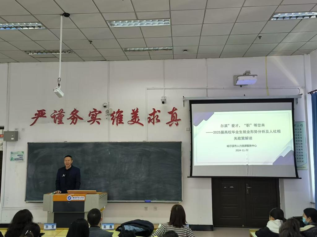 为扎实做好我校学生就业指导工作,帮助毕业生了解当前就业形势及地方引才政策,掌握求职技巧,引导学生提高就业的主动性,提升就业的紧迫感,招生就业处联合哈尔滨市人力资源服务中心于11月22日开展“多彩人生 助你前行”就业指导系列活动——就业专家宣讲会。