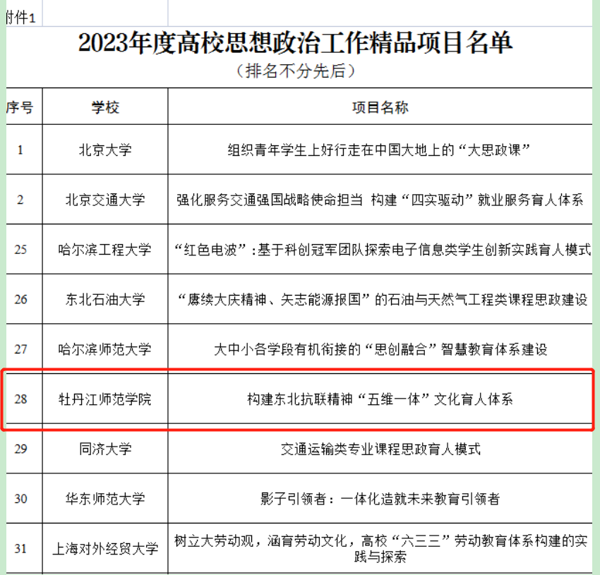 近日,教育部官方网站公布了2023年度高校思想政治工作质量提升综合改革与精品建设项目入选名单。我校党委宣传部组织申报,计算机与信息技术学院陈君博士主持的《构建东北抗联精神“五维一体”文化育人体系》,经过多重遴选,在全国众多项目中脱颖而出,成功获批。