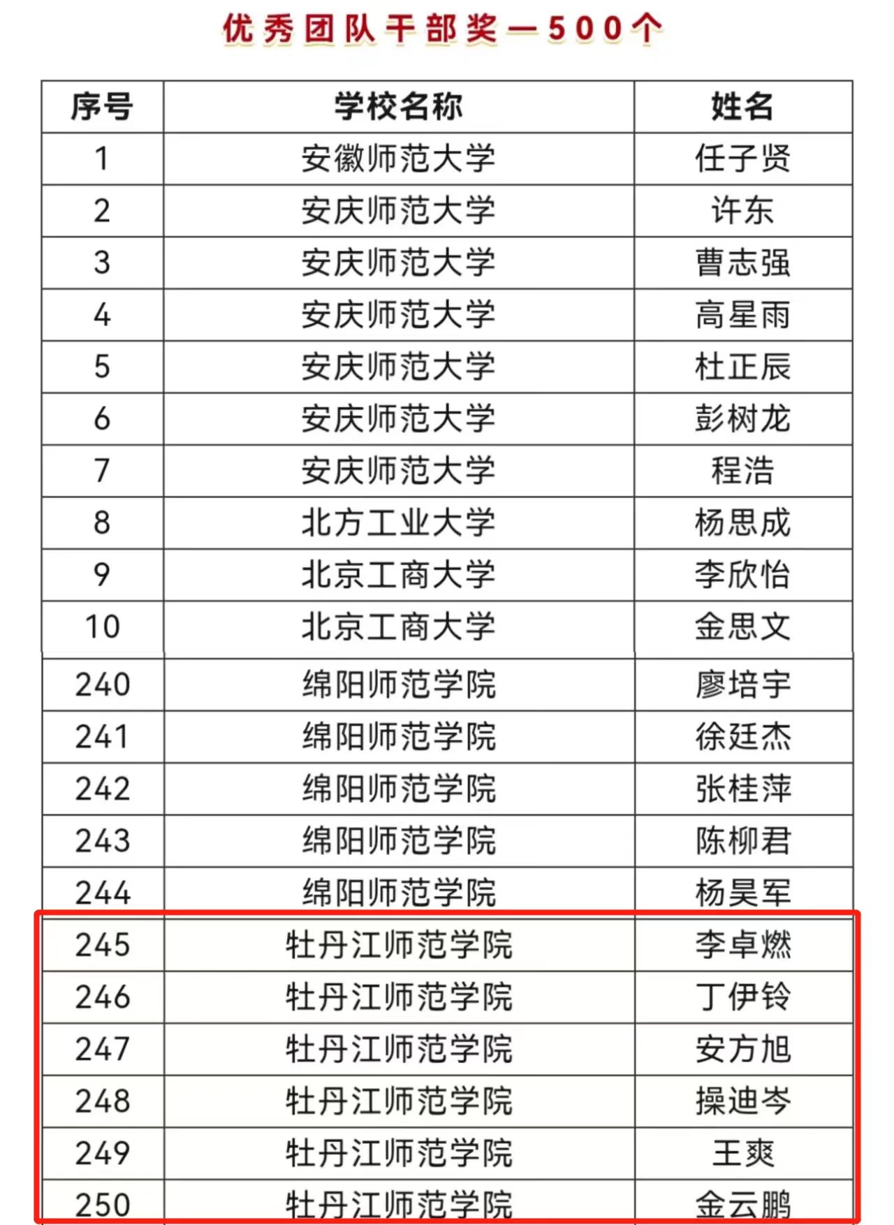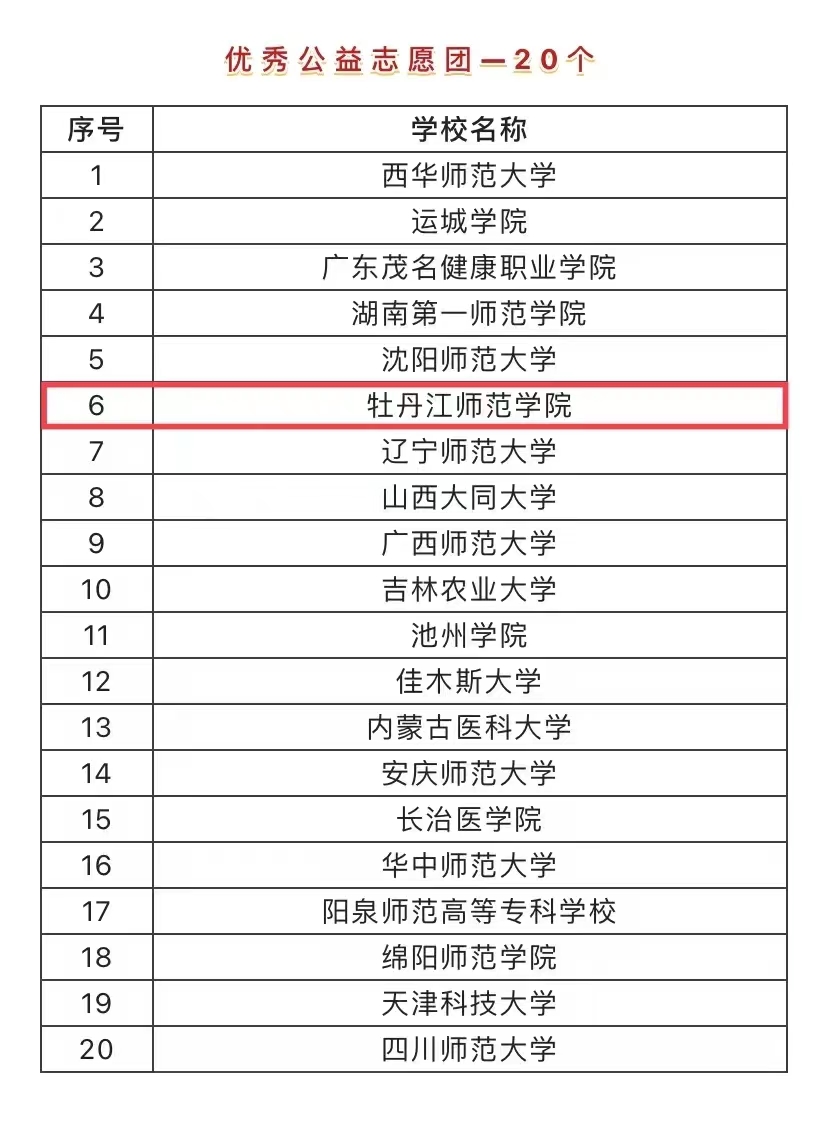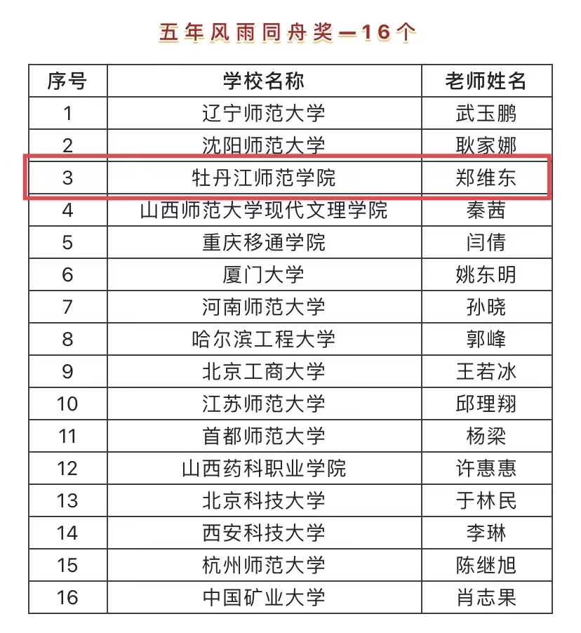近日,由中国教师发展基金会、中国教育发展基金会主办,教学考试杂志社承办,中国教育电视台协办的2021-2022年度“感谢恩师·你我同行”大型公益活动落下帷幕。在全国参与的2287所高校中,我校喜获多项荣誉。牡丹江师范学院荣获“卓越组织奖”和“优秀公益志愿团”,郑维东老师荣获“五年风雨同舟奖”,关鑫、王明磊老师荣获“优秀指导教师奖”,李卓燃等6名同学荣获“优秀团队干部奖”。