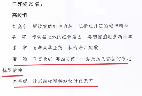 近日,中共牡丹江市委教育工作委员会、中共牡丹江市委宣传部对牡丹江市第三届思政课慕课教学大赛的评选结果进行了公示。我校荣获优秀组织奖;我校马克思主义学院2020级马克思主义中国化研究专业学生董颖的作品《气贯长虹 英雄史诗——弘扬历久弥新的东北抗联精神》和2021级学科教学(思政)专业学生姜英旗的作品《让老航校精神绽放时代光芒》喜获三等奖。