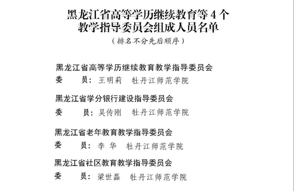 近日,黑龙江省教育厅发布《省教育厅关于成立高等学历继续教育等4个教学指导委员会的通知》,公布了教学指导委员会组成人员名单。我校王明莉获聘省高等学历继续教育教学指导委员会委员,吴传刚获聘省学分银行建设指导委员会委员,李华获聘省老年教育教学指导委员会委员,梁世磊获聘省社区教育教学指导委员会委员。