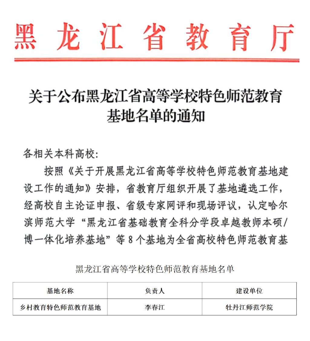 近日,黑龙江省教育厅发布了《关于公布首批黑龙江省实验教学和教学实验室建设研究项目的通知》和《关于公布黑龙江省高等学校特色师范教育基地名单的通知》,我校“教师教育实验教学资源建设与数字化研究”获批省内唯一教育学门类重点项目,“乡村教育特色师范教育基地”获批唯一面向服务龙江乡村教育振兴的省级特色师范教育基地。