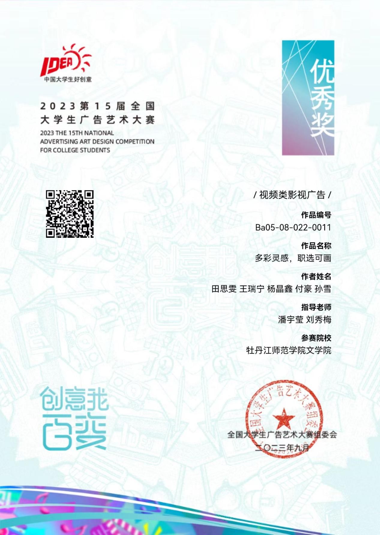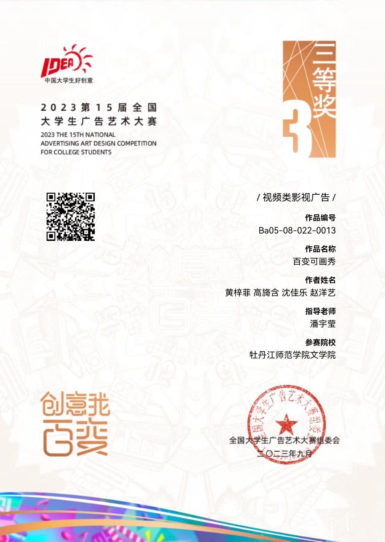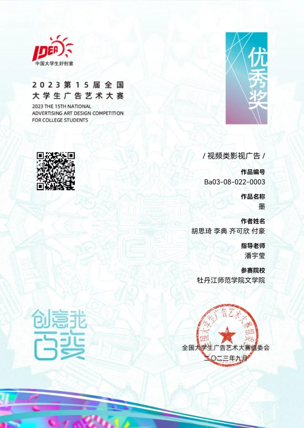 近日,第15届全国大学生广告艺术大赛比赛结果揭晓。我校学生在全国总决赛中荣获三等奖1项、优秀奖2项,在黑龙江省赛中荣获一等奖6项、二等奖4项、三等奖15项、优秀奖65项。