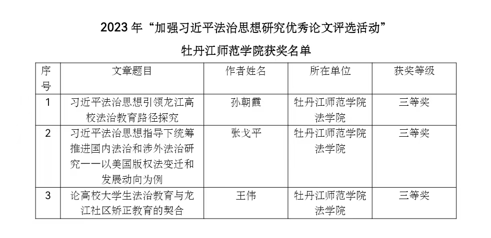 近日,黑龙江省委政法委、省委依法治省办、省司法厅、省社科联、省法学会发布了《关于“加强习近平法治思想研究优秀论文评选活动”评选结果的通报》。我校喜获三等奖3项。