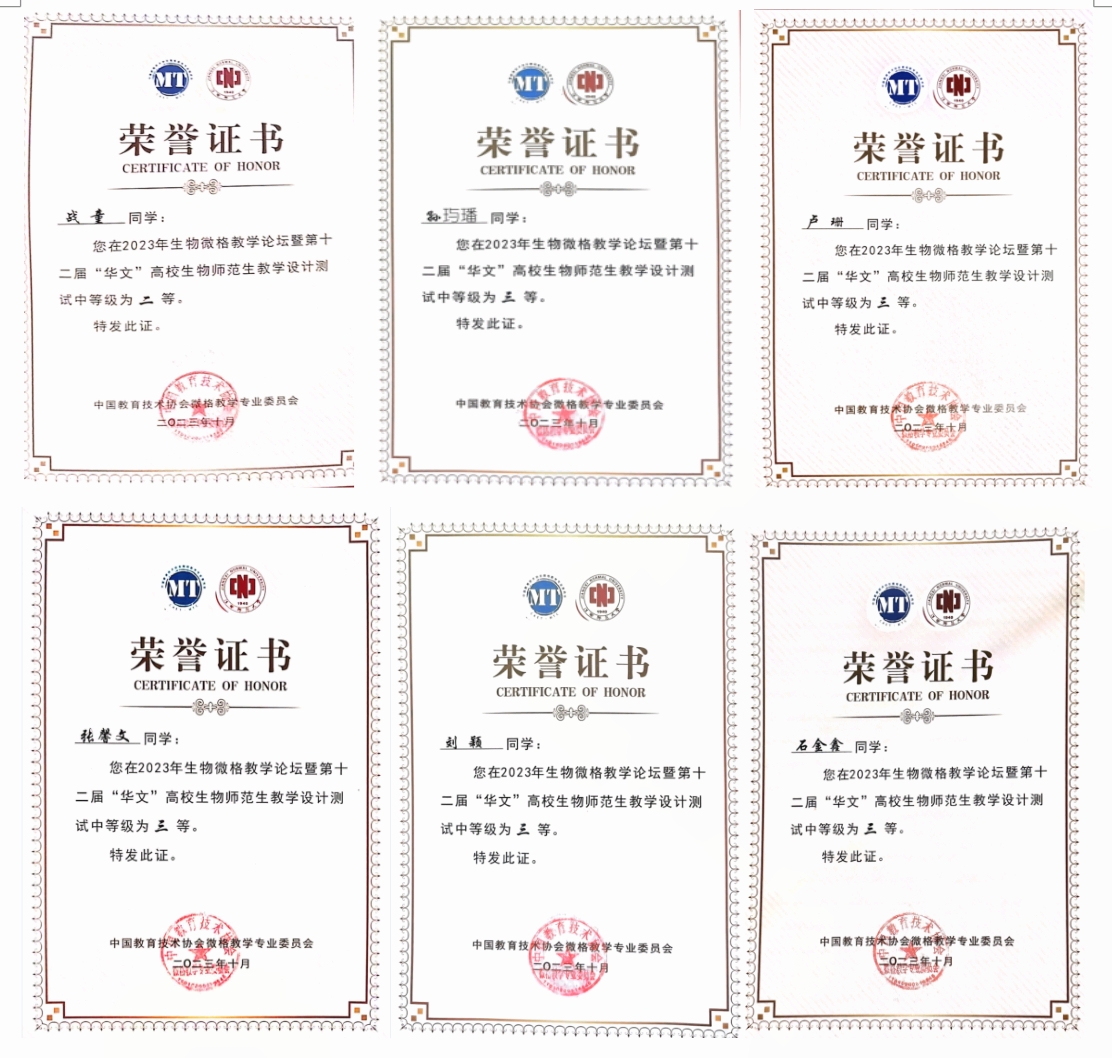 近日,第十二届“华文”高校生物学师范生教学技能测试与交流展示活动在江西南昌落下帷幕。我校生命科学与技术学院选派生物科学专业6名同学参赛,在教学能力测试中获二等奖2项、三等奖4项,在教学设计能力测试中获二等奖1项、三等奖5项。