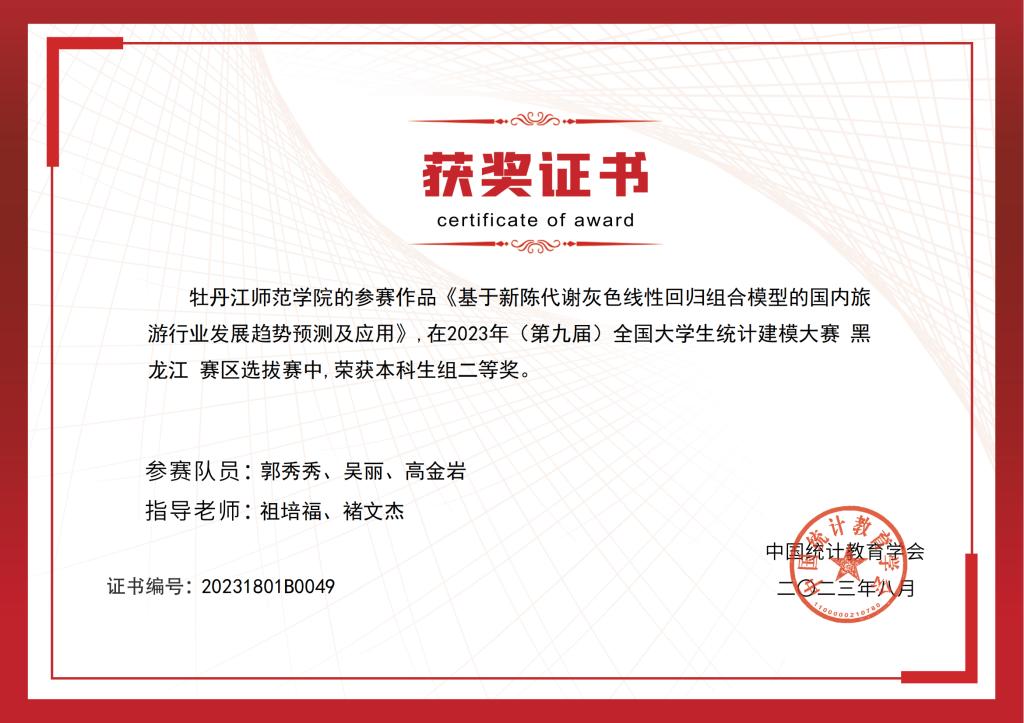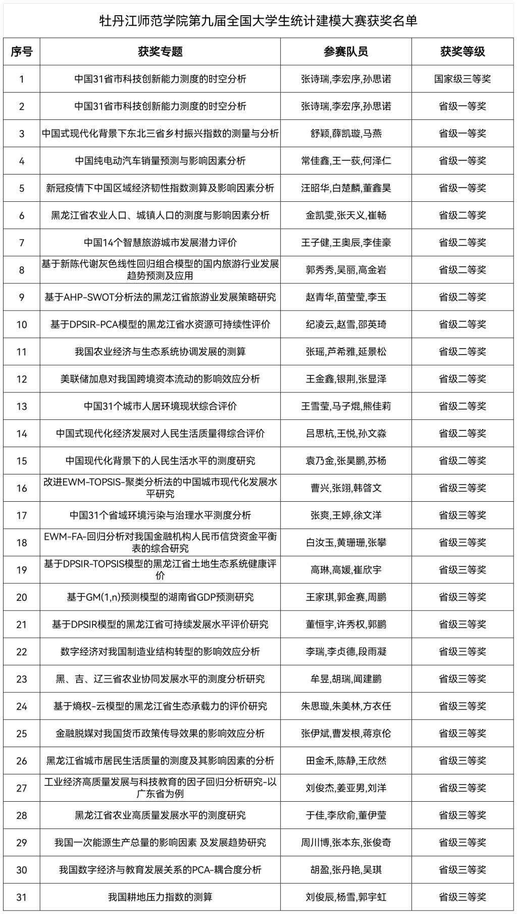 近日,第九届全国大学生统计建模大赛总决赛在杭州落下帷幕。我校由数学科学学院张诗瑞、李宏序、孙思诺组成的团队,在教师赵文英的指导下荣获国家级三等奖;数学科学学院30支团队荣获黑龙江省赛区一等奖4项、二等奖10项、三等奖16项。我校代表队获奖率为60%,在黑龙江省高校中名列前茅。