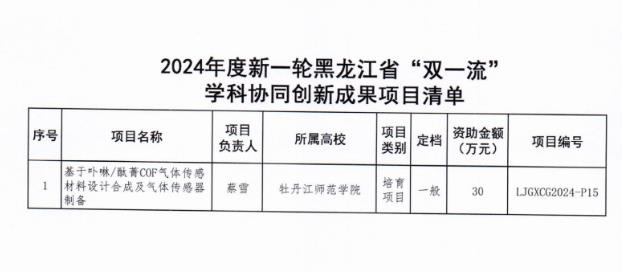 近日,黑龙江省教育厅公布了2024年度新一轮黑龙江省“双一流”学科协同创新成果项目清单。我校蔡雪教授的《基于卟啉/酞菁COF气体传感材料设计合成及气体传感器制备》项目成功获批2024年度新一轮黑龙江省“双一流”学科协同创新成果项目。