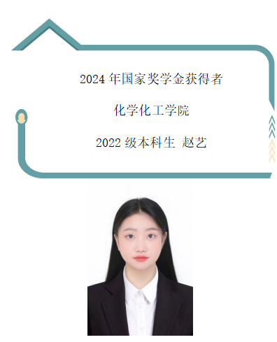 赵艺,女,中共预备党员,化学化工学院2022级化学一班团支书,曾任校团委直属团总支宣传部干事,牡丹江师范学院第十一期“青马工程”培训班成员。自入学以来,她始终坚持着积极向上的态度,时时刻刻以高标准要求自己。曾获国家奖学金、黑龙江省普通高等学校“三好学生”荣誉称号、两次获得牡丹江师范学院“三好学生”荣誉称号、校级二等学业奖学金。她也严格律己认真参加学院五四训练,并在大家团结奋斗下取得牡丹江师范学院第四十四届“五·四”火炬接力赛B组冠军。与此同时,她利用专业所学知识积极参加创新创业类大赛,获国奖一项、省奖两项、校级奖励两项。她还积极投身各类社会实践及志愿服务活动,如暑期“三下乡”之“云支教”系列活动等。