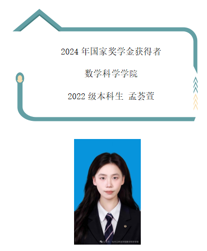 孟荟萱,女,共青团员,数学科学学院学生会主席、数学与应用数学2202班班长,曾荣获校一等专业奖学金、黑龙江省普通高等学校“三好学生”、校级“三好学生”“优秀学生干部”、东北三省数学建模联赛二等奖、东北三省数学建模联赛三等奖、全国大学生统计建模大赛黑龙江赛区选拔赛三等奖。在科研方面,她主持2023年国家级大创项目一项,于2024年6月成功结项。在省级期刊发表论文一篇,以本人为第一作者的论文《自媒体时代下学生学习心理分析及支教方式新途径探究》被才智2024年第24期收录。