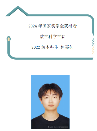 何嘉亿,男,共青团员,数学科学学院2022级数学与应用数学专业学生,曾荣获黑龙江省“三好学生”、校“三好学生”、校一等专业奖学金、全国大学生数学竞赛二等奖、东北三省数学建模联赛二等奖、东北三省数学建模联赛三等奖、天府杯建模联赛暨交通出行专题三等奖、第六届全国大学生数学竞赛网络挑战赛省级优秀奖、中国国际大学生创新大赛牡丹江师范学院选拔赛优秀奖。在科研方面,他参与2023年国家级大创项目一项,与项目负责人共同扎根乡村,研究乡村教育,于2024年6月成功结项。