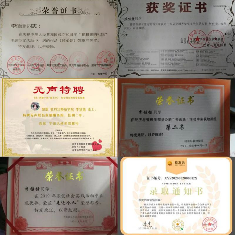 李恬恬学习成绩优异,2018-2019年度专业排名第三,2018-2019年度获得国家励志奖学金。但除了学习之外,她还有一个从小就渴望成为的模样:伏笔在桌案旁的思考者——作家。