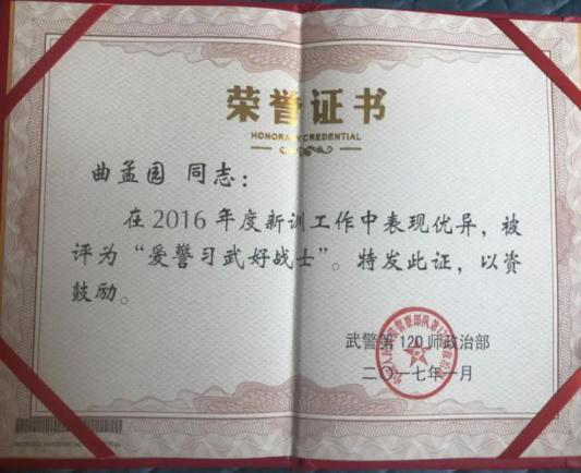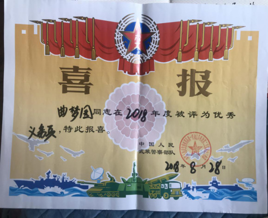 曲孟园从小就有立志报国梦,渴望成为一名军人,希望能够有机会保卫祖国、建功立业,2016年作为一名刚适应大学生活的大一新生,在接到入伍宣传时,毫不犹豫舍弃人生的“舒适圈”,响应国家号召,投笔从戎,应征入伍,成为了一名中国人民武装警察部队某部纠察班战士。两年的军旅生涯,塑造了他坚韧的品格、锻造了强健的体魄、锤炼了奉献和担当精神。他在新兵营期间就表现突出,获得三公里越野考核第1名、自动步枪射击98环的优异成绩。曲孟园服役的武警部队在2014—2016年肩负着赴新疆维稳的工作,他作为维稳替补队员,严阵以待,也时刻做好了援疆准备;2017年,中央军委改革强军战略全面推进,全军新调整组建了84个军级单位,他所在的部队也面临换防和搬迁工作,曲孟园此时重任在肩,协助领导负责该部队100多辆军车换防运输的交通指挥及道路疏导工作,使部队换防搬迁工作得以顺利进行。因服役期间表现突出,获得“优秀义务兵”荣誉称号和嘉奖,被武警某部政治部评为“爱警习武好战士”称号。他将人生最好的青春年华奉献给祖国和军营,用奋斗书写无愧于时代的华彩篇章。