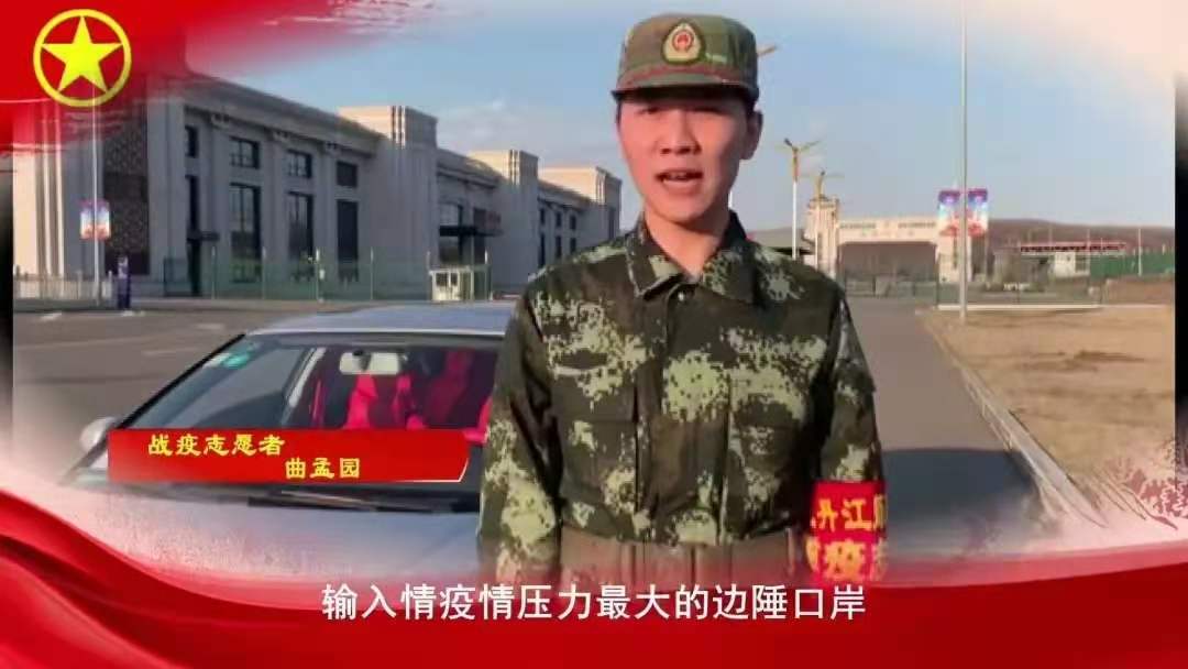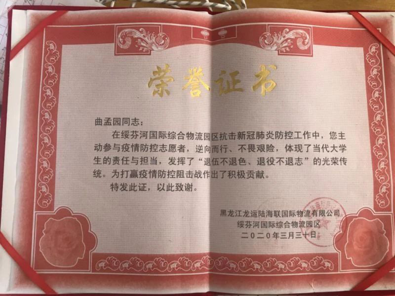 4月15日,为充分发挥共青团组织在疫情防控中的引领凝聚作用,牡丹江师范学院驻绥芬河战疫志愿者服务队成立,线上召开临时团支部成立大会,选举曲孟园担任临时团支部书记,负责协助绥芬河市委市政府开展物资运输、小区管控、知识宣讲、清洁消毒等志愿服务工作。他的事迹被绥芬河广播电视台、牡丹江市广播《全市新闻联播》等多家媒体采访报道,受到社会广泛好评,彰显了退役军人的职责与担当,用切实的行动、真诚的服务践行着不变的初心,向党组织、团组织交出了一份满意的答卷。